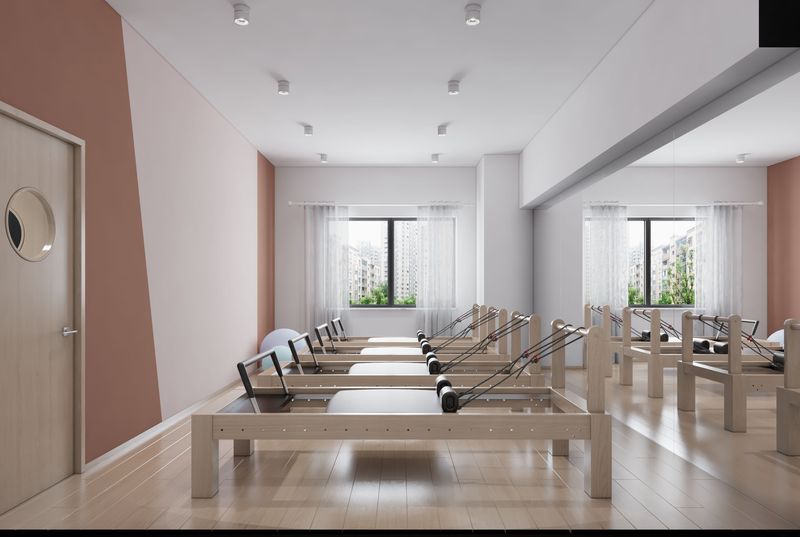 布局灵活性:采用开放式无柱设计,便于根据课程类型(如哈他瑜伽、空中瑜伽、高温瑜伽)调整空间。墙面安装可折叠隔断或纱帘,实现大班课与小班私教的灵活切换。